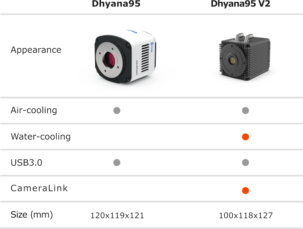 Dhyana95 V2 adopts Tucsen’s new technology and performance standard. The smallest dimension among peers for scientific imaging makes it more popular for demanding compact space. The water-cooling method and CameraLink interface apply the camera for conditions requiring high stability.